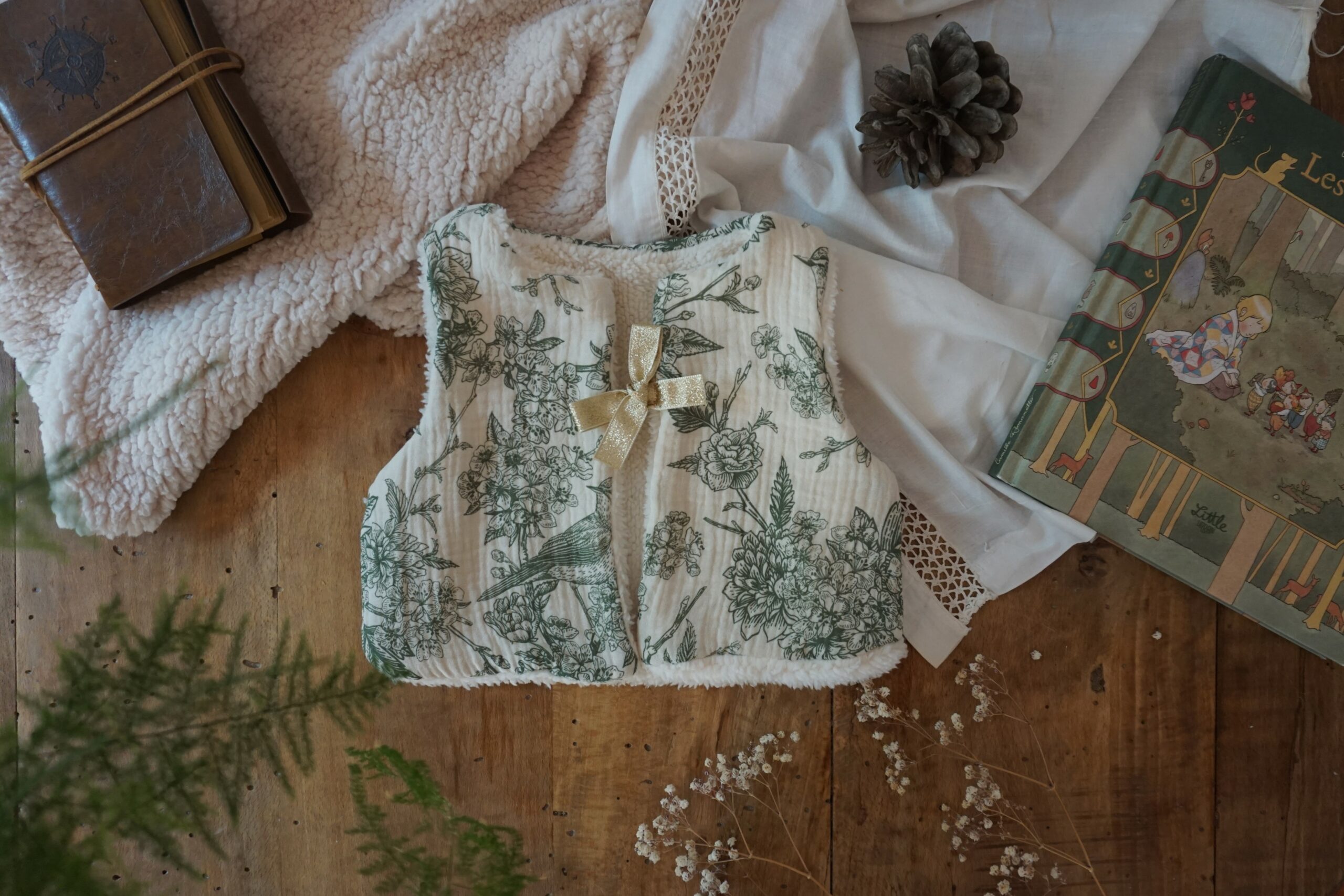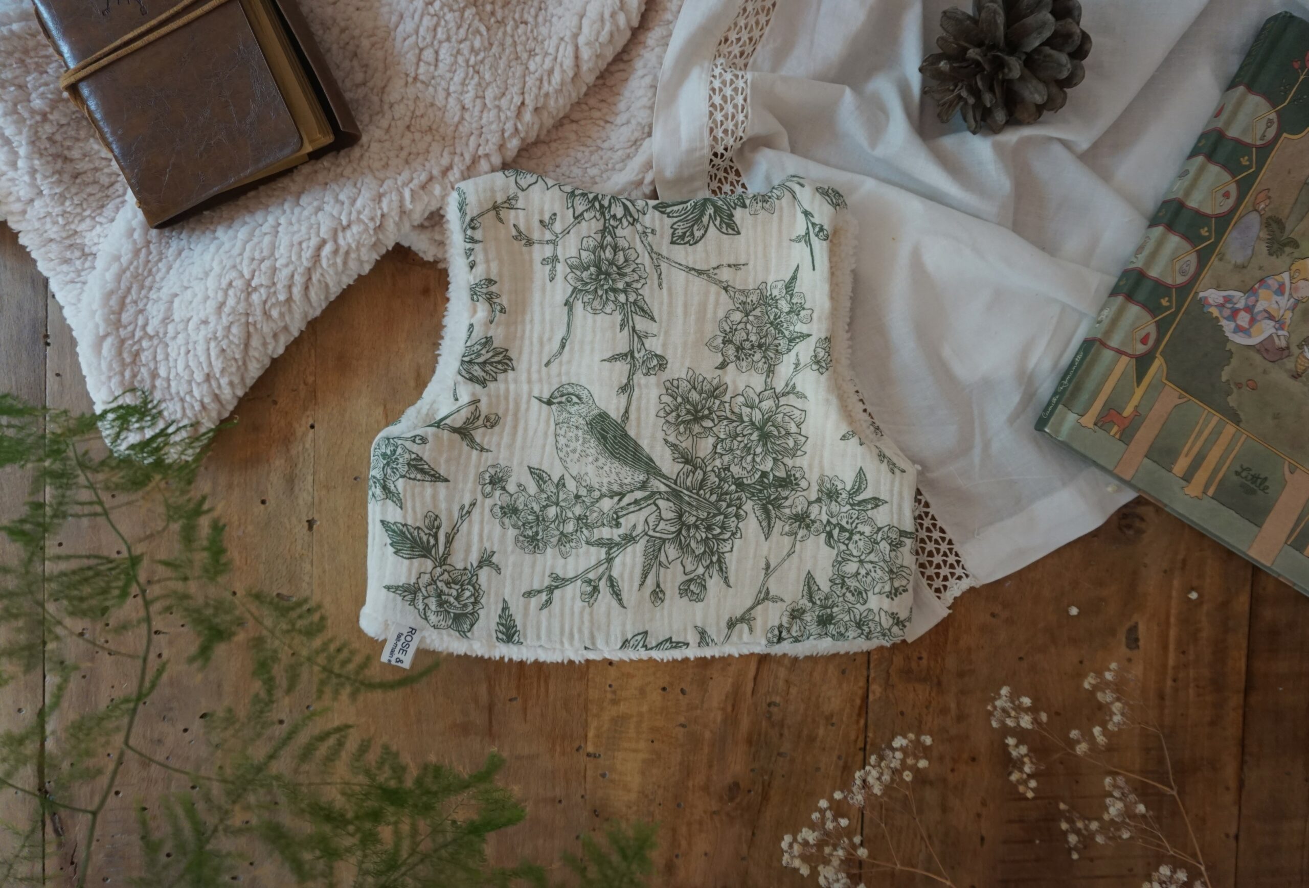 Ce gilet de berger réversible en coton double gaze Oeko Tex certifié sans substance nocive, est une douce promesse de confort et d’amour.
