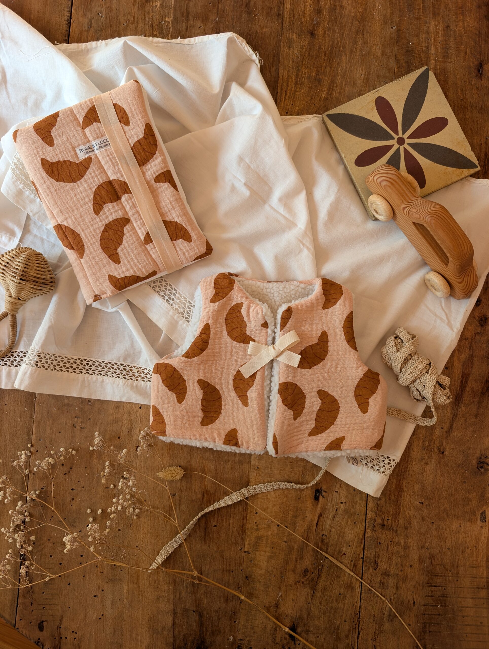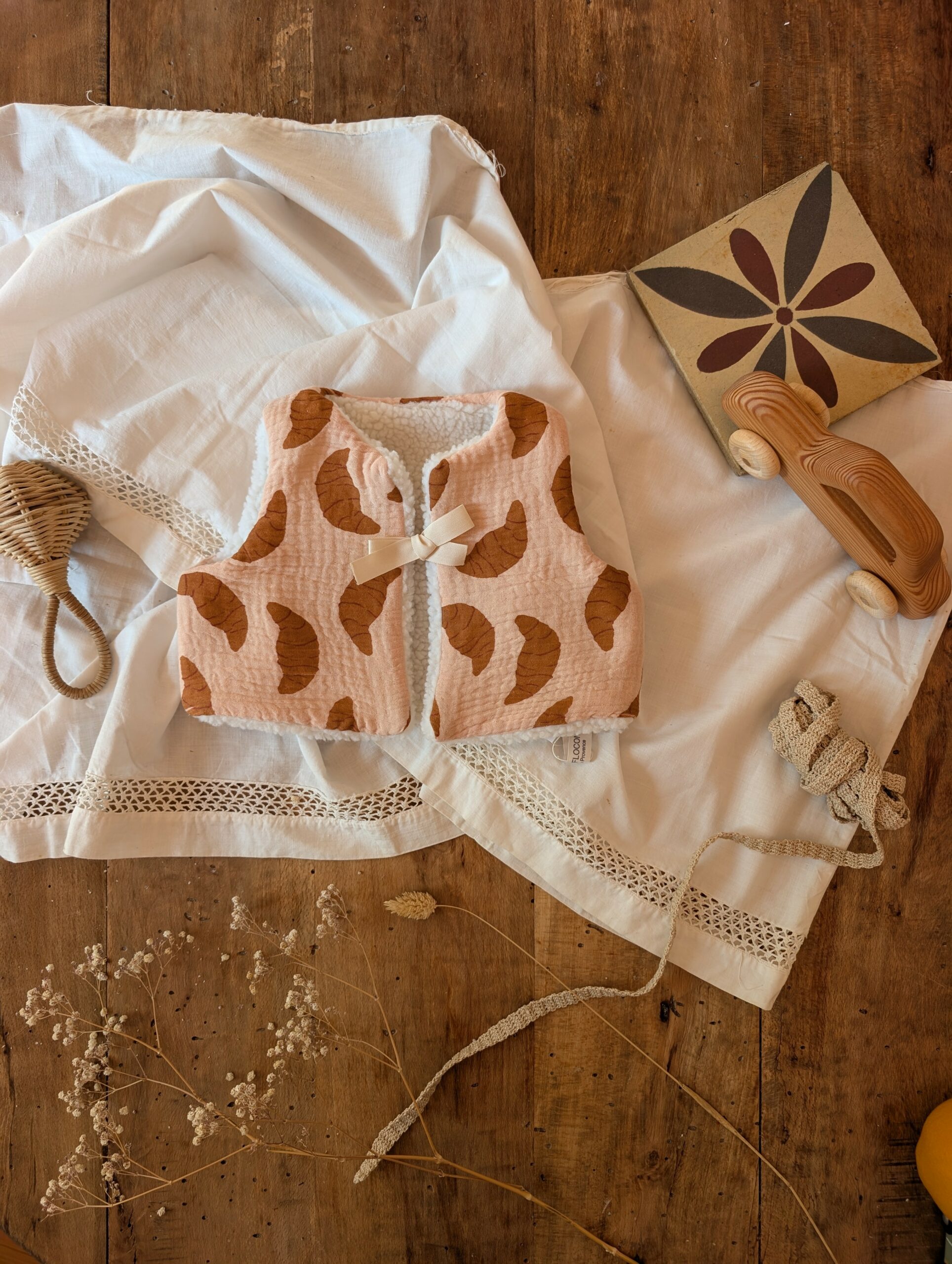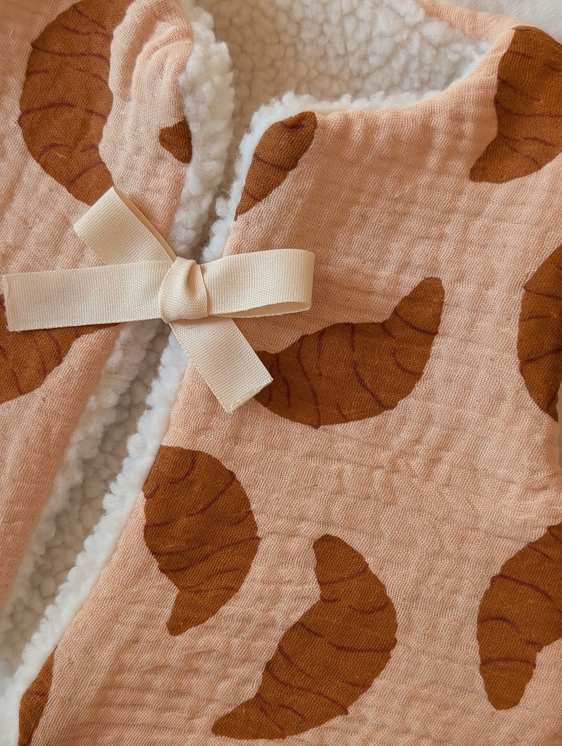 Ce gilet enfant réversible incarne la joie, la tendresse et le souvenir des matins doux. Son imprimé croissant rappelle le bonheur des viennoiseries chaudes, tandis que sa face unie assortie assure une élégance douce et intemporelle.
