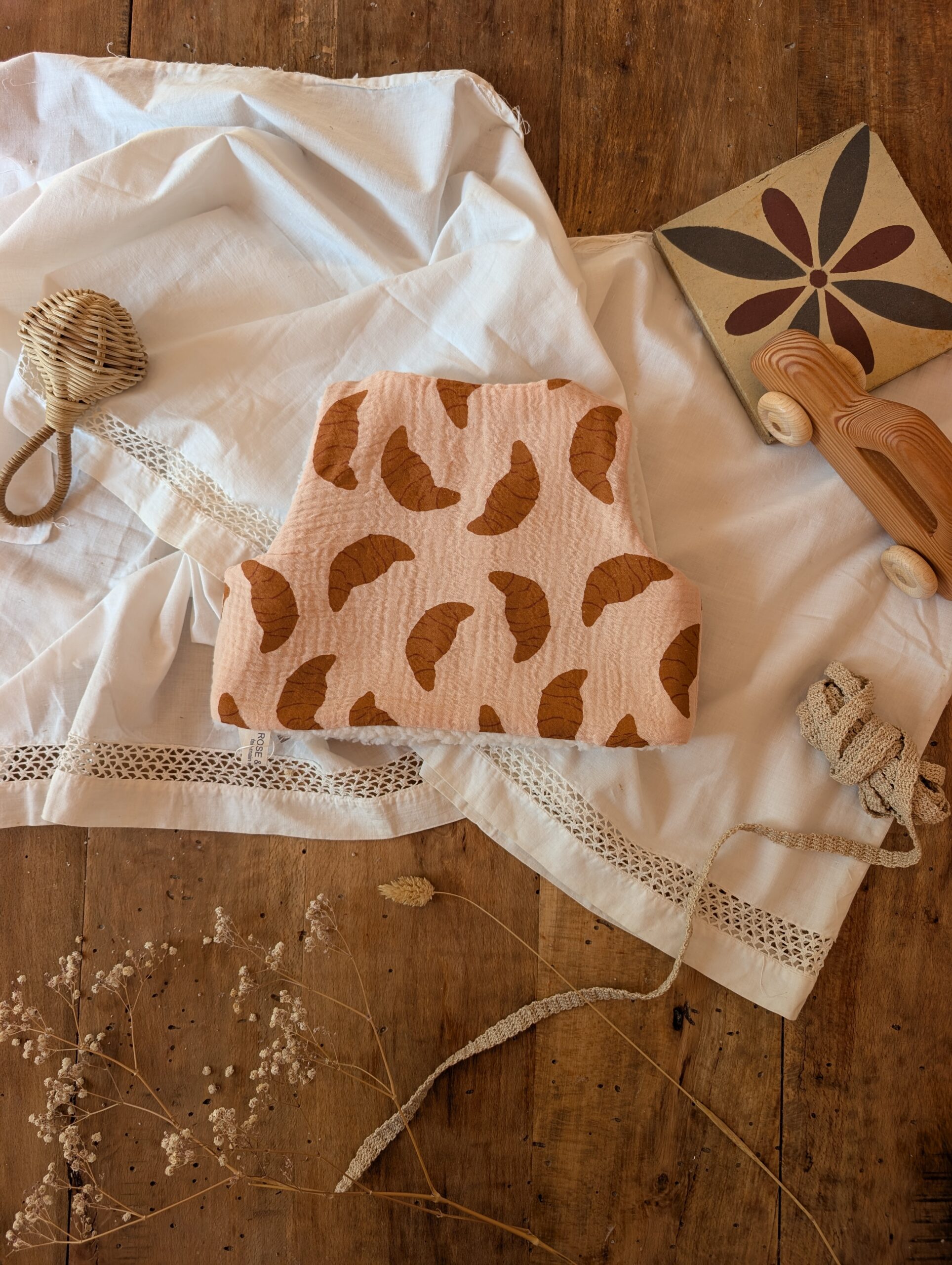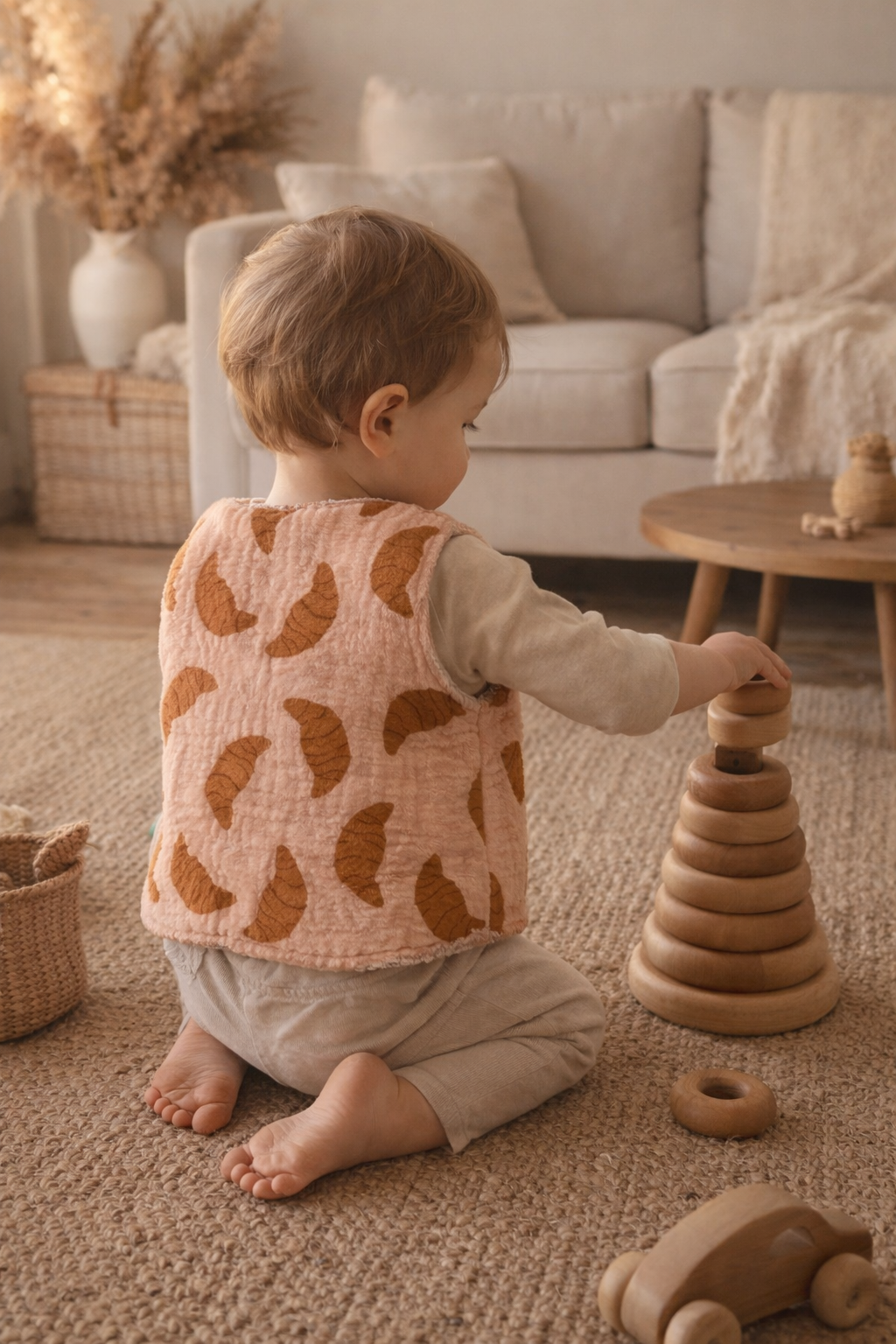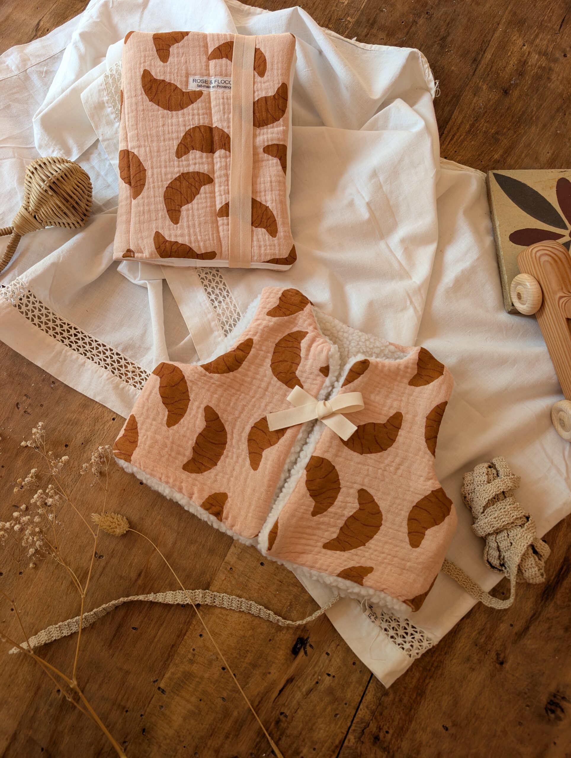 Ce gilet enfant réversible incarne la joie, la tendresse et le souvenir des matins doux. Son imprimé croissant rappelle le bonheur des viennoiseries chaudes, tandis que sa face unie assortie assure une élégance douce et intemporelle.