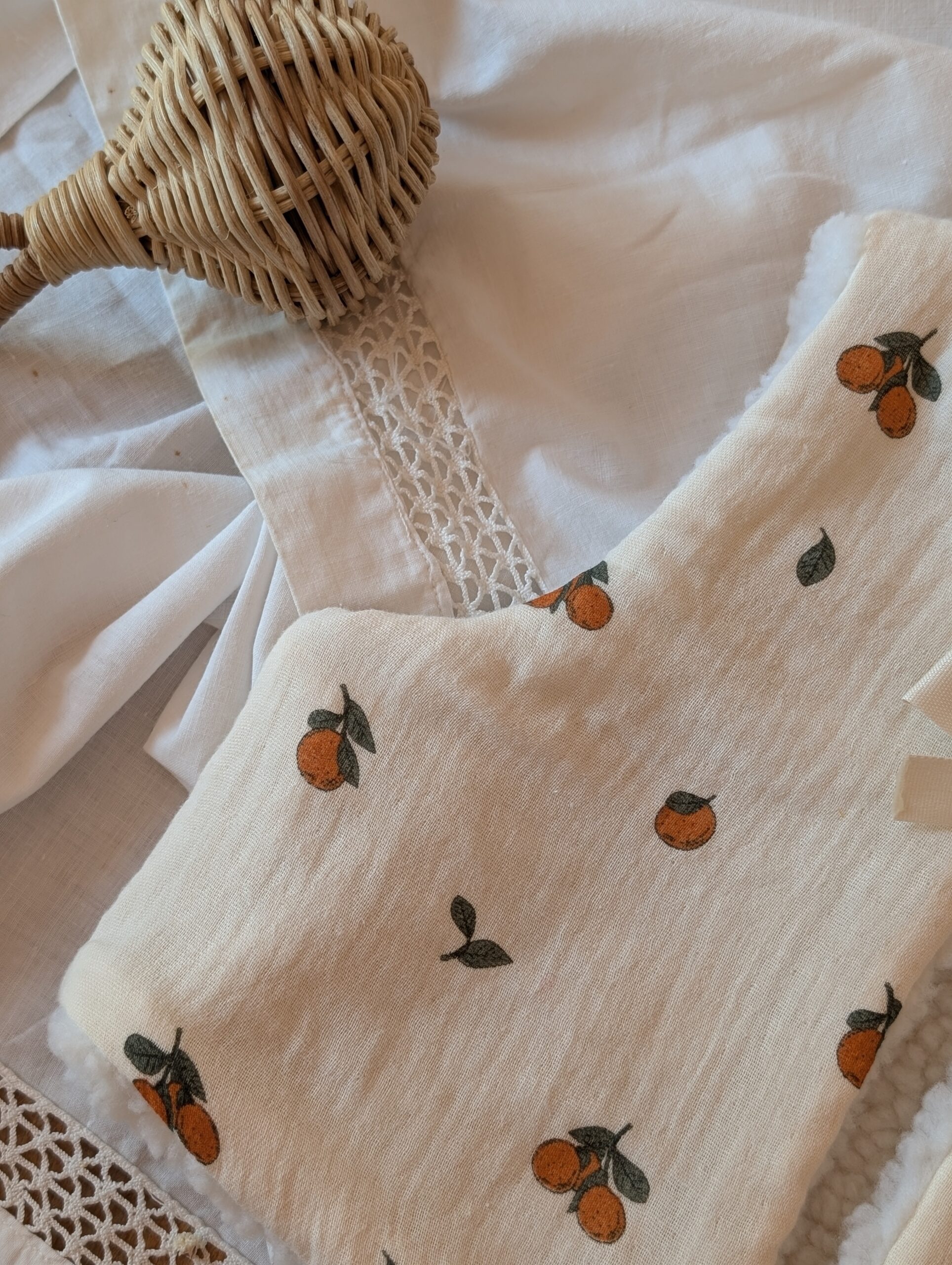 Son motif « Oranges » apporte une note fraîche et vitaminée, tandis que la face unie coordonnée permet de changer de look en un geste.