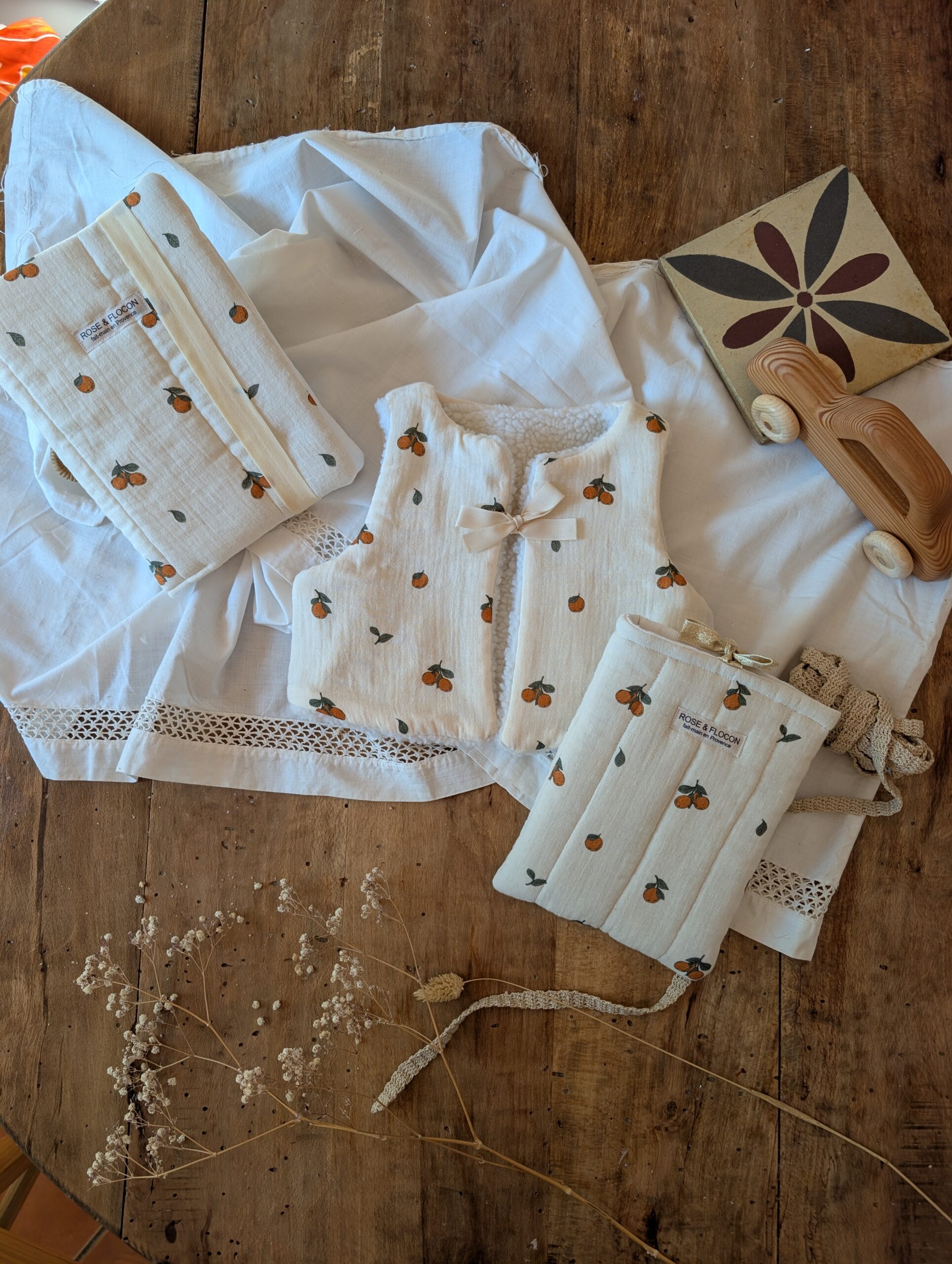 Chaque gilet est cousu à la main dans mon atelier, uniquement à la commande. Cette fabrication raisonnée évite le stock inutile et valorise un savoir-faire artisanal français.