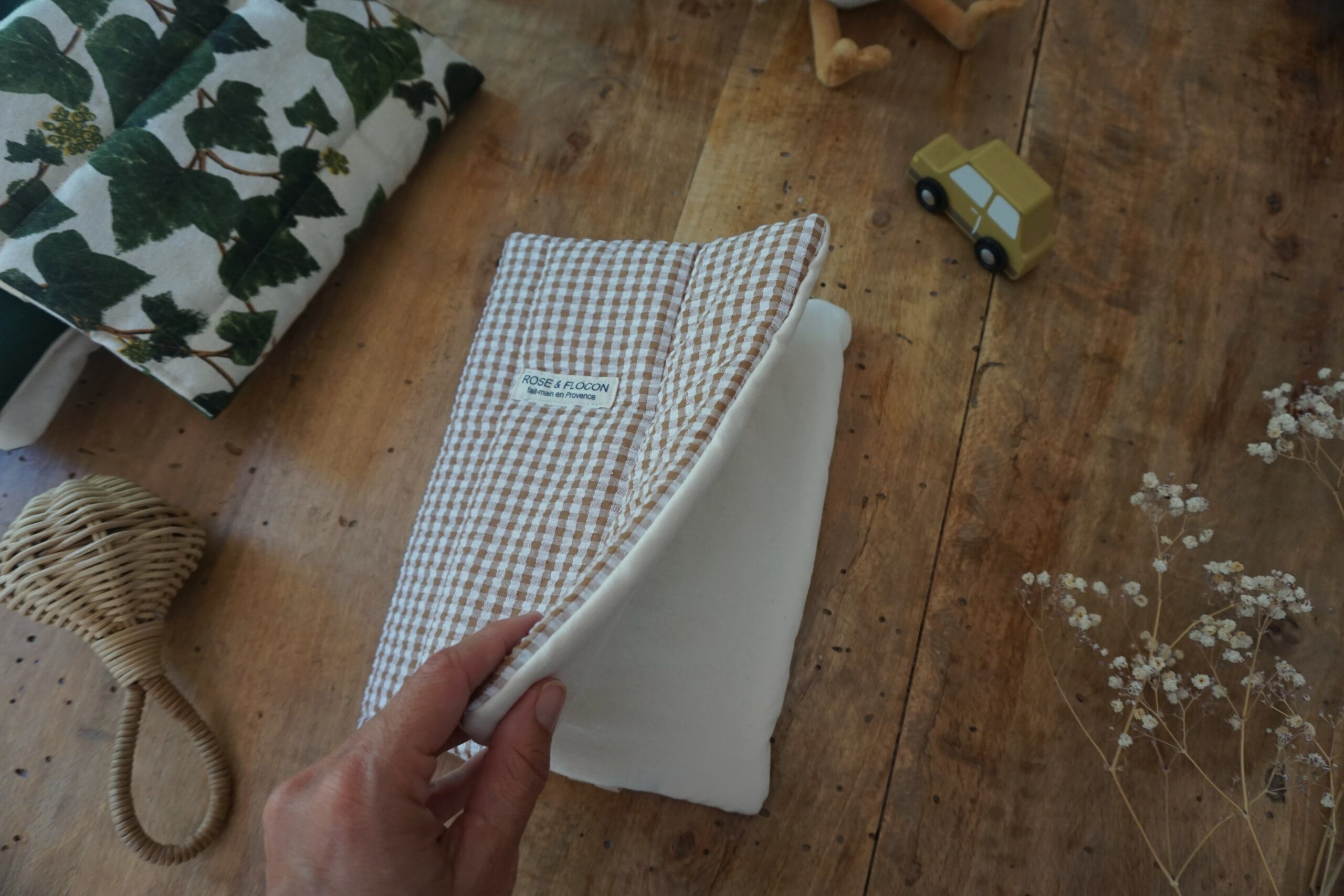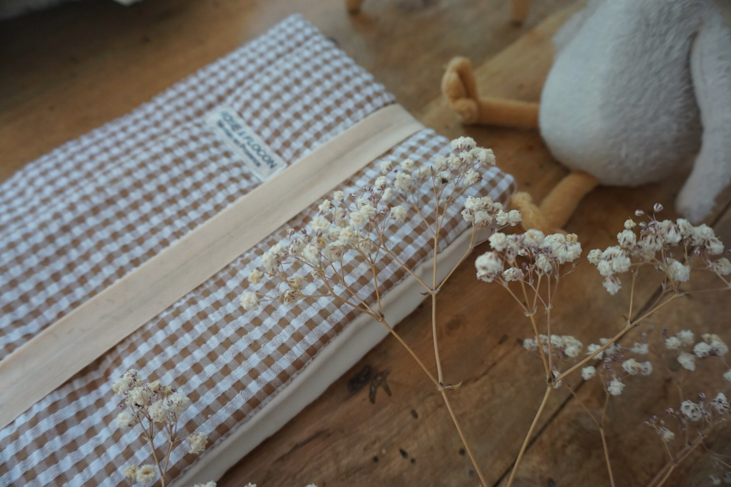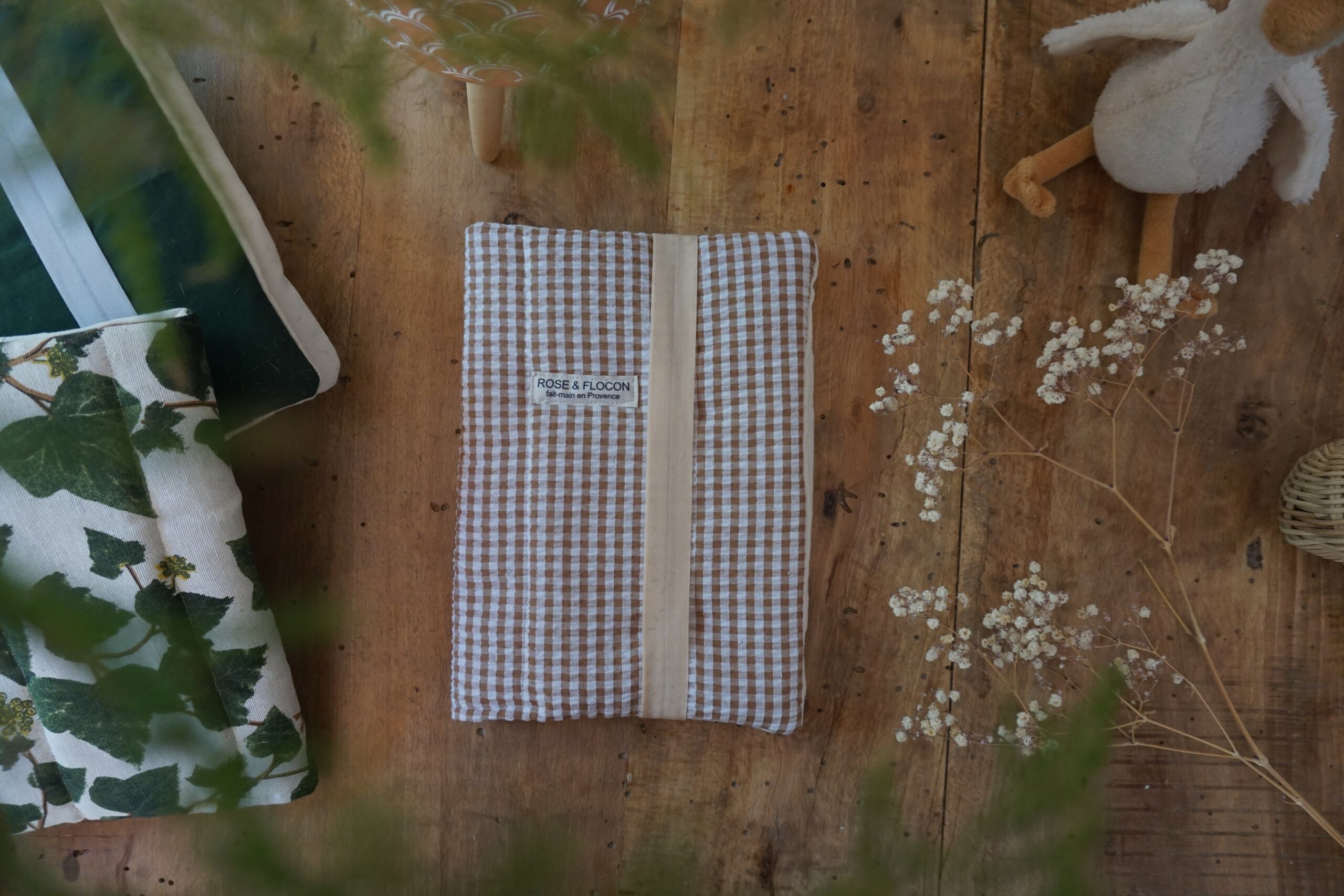 Son tissu en coton seersucker vichy rappelle la chaleur d’un bon mocha. Associé à une ouate Oeko-Tex, il protège les documents médicaux importants avec douceur et style.